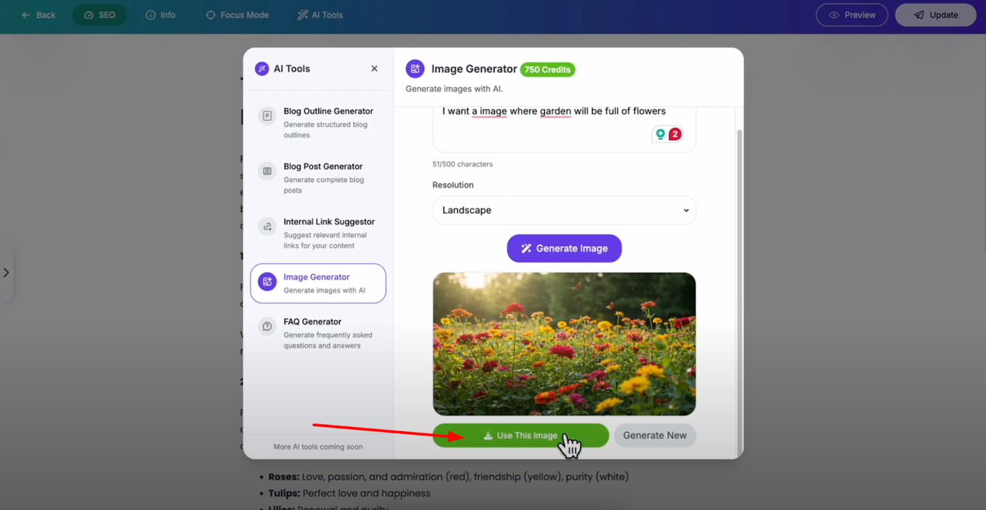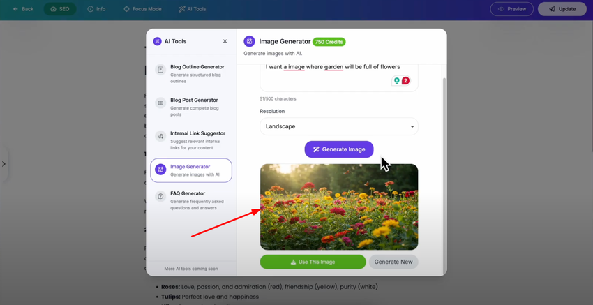 If you're satisfied with the generated result, click "Use This Image" to add it directly to your blog post. The image will be automatically inserted after your selected element in your content.