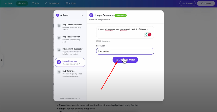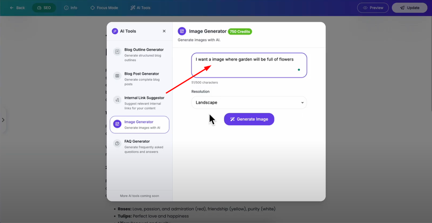 The image generator AI tool gives you the power to create professional custom images that enhance your blog posts and make your content more visually engaging without requiring design skills or stock photo subscriptions.