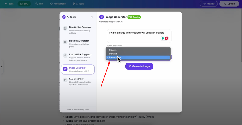 After entering your description, you can customize the resolution of your image from the available options. Choose the resolution that best fits where you plan to use the image in your blog post — higher resolutions for featured images, smaller ones for inline content.