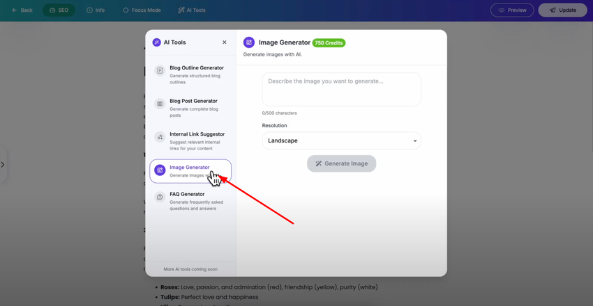 Click on it to access all available AI tools, then select the "Image Generator" from the list. This powerful tool allows you to create custom images using AI based on your text descriptions.