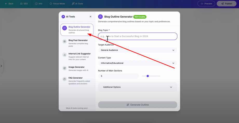From the list, select the "Blog Outline Generator" — this powerful tool helps you create well-structured blog post outlines in seconds.