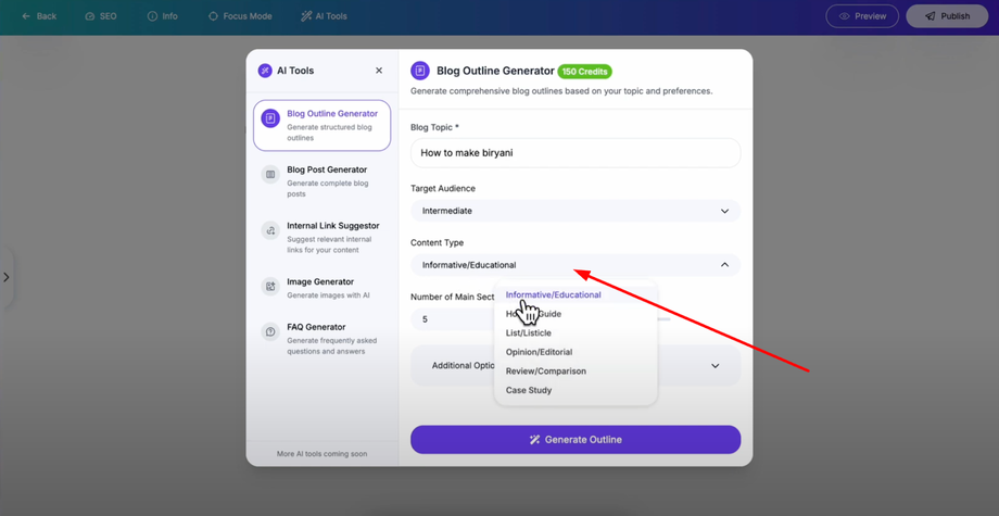 In the content type section, select what kind of blog post you want to create — this helps the AI understand the style and structure you need for your specific type of content, whether it's a tutorial, list post, or informational article.