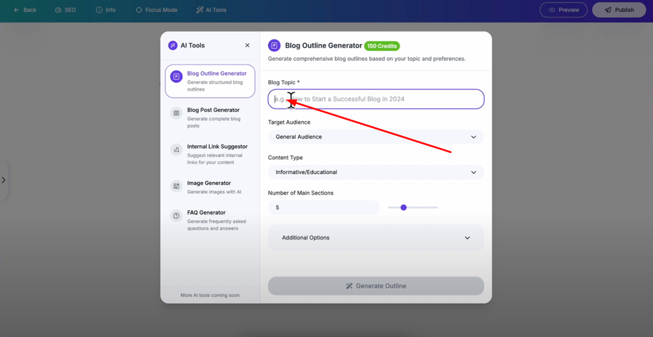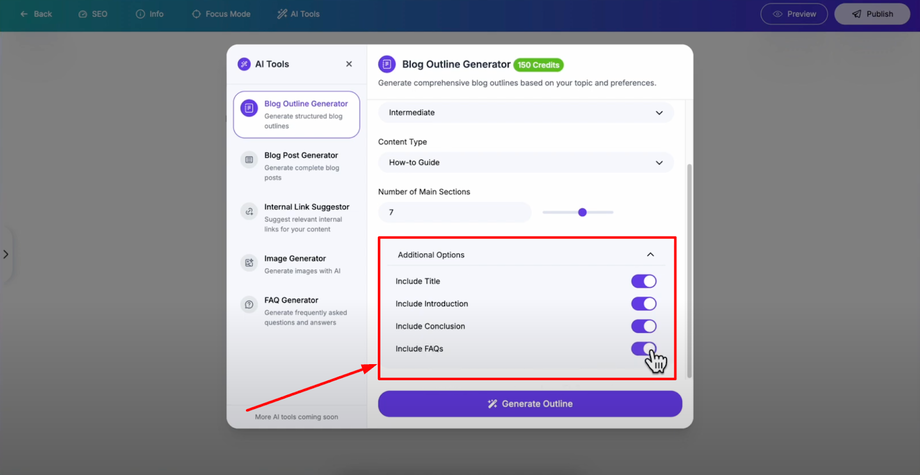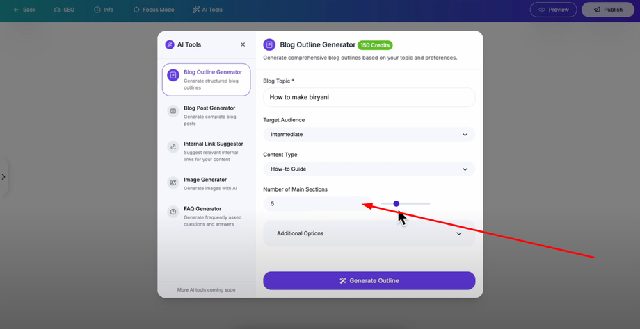 Specify how many sections you want in your blog post to control the depth and length of your outline based on your content requirements. This allows you to create shorter, focused posts or comprehensive, detailed guides.