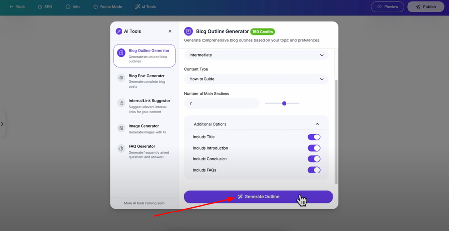 Once you've configured all your preferences, click the "Generate Outline" button. The AI tool will create a comprehensive outline for your blog post in just a few seconds based on your specifications.