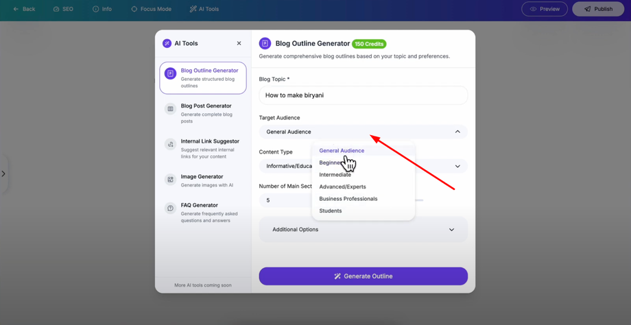 Select your target audience from the dropdown menu with different options to choose from. Choose the audience that best matches who you're writing for to ensure the outline matches their knowledge level and interests.