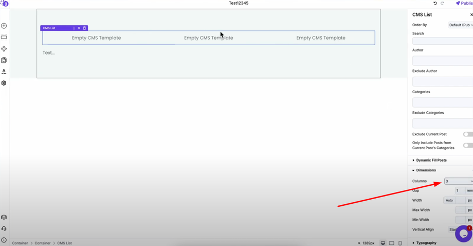 Go to the dimension section and select "Columns" to create a column layout for your CMS list. This organizes your content in a grid format that's visually appealing and responsive across devices.