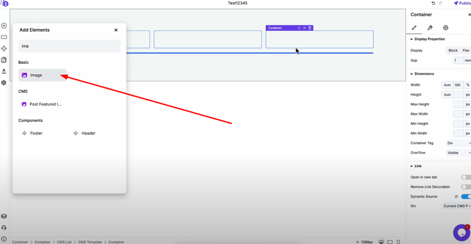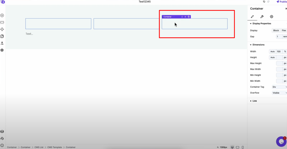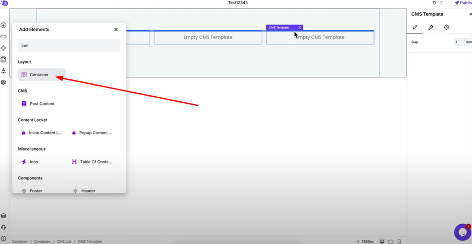 Add a container by dragging it from "Add Elements" and placing it inside the CMS list.