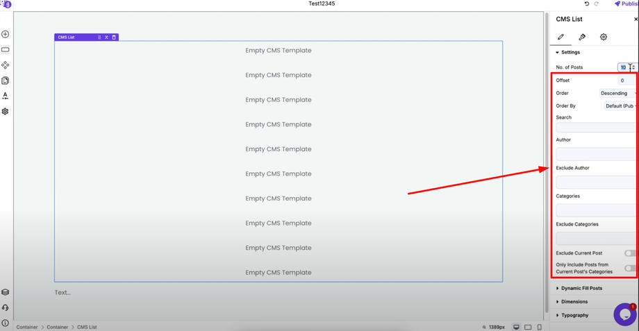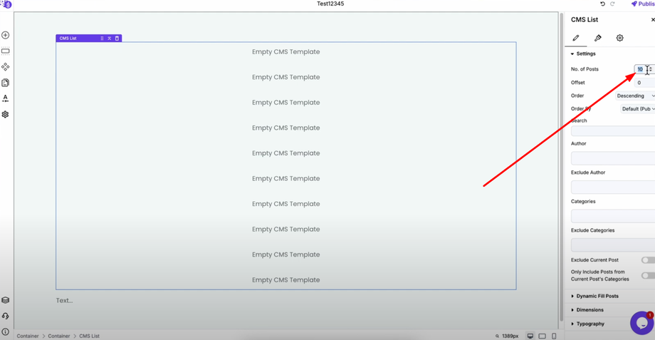 Once the CMS list is added, open its settings to customize how your content displays. Set the number of posts according to your requirement.