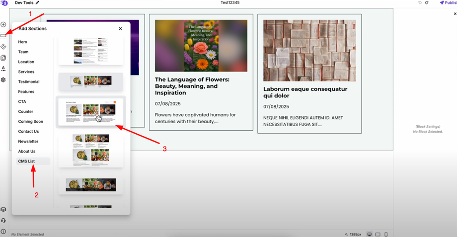Alternatively, you can add a CMS list by selecting the "Add Sections" option in the left panel. Click on it and navigate to the "CMS List" section where you'll find a variety of ready-to-use CMS lists. Choose one that you like and drag it into the editor for quick implementation.