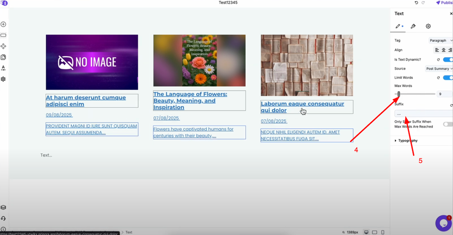 For the post excerpt, add another text block. Toggle on "Is Text Dynamic", select "Post Summary", and limit the number of words as per your requirement. You can also add a suffix like three dots for a clean, professional look.