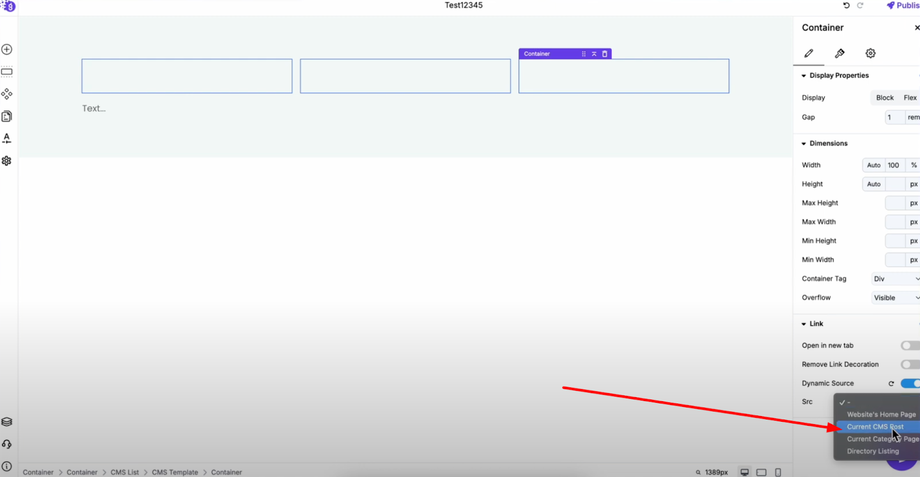 Link this container dynamically to the CMS post by going to its settings, opening the link section, and toggling on "Dynamic Source". Then select "Current CMS Post" — this makes your container clickable and linked to CMS posts dynamically.
