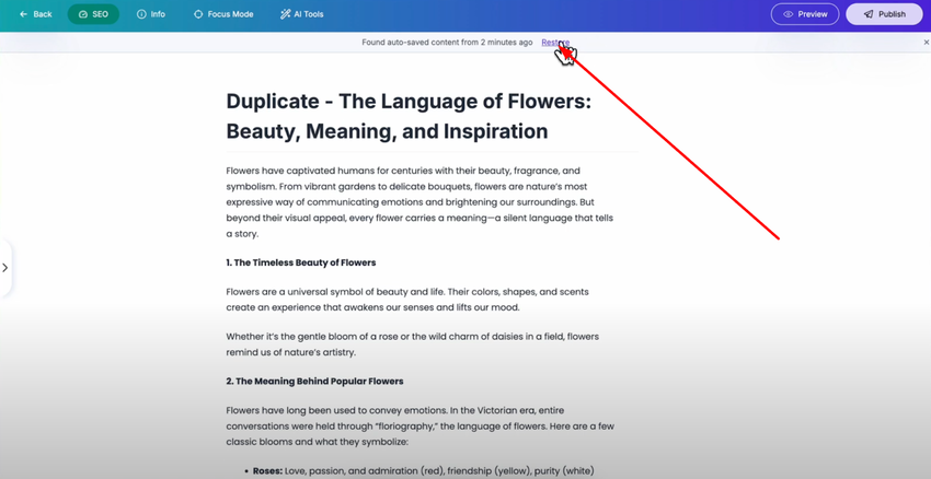 When you go back to your dashboard and reopen the same post, you'll see a restore option appears automatically. Simply click on the "Restore" button, and all the changes you made will be restored exactly as you left them before the crash or unexpected closure.