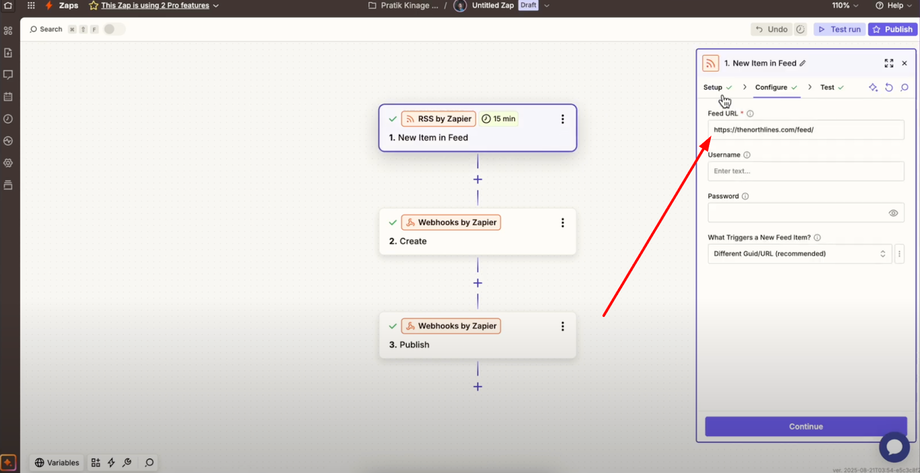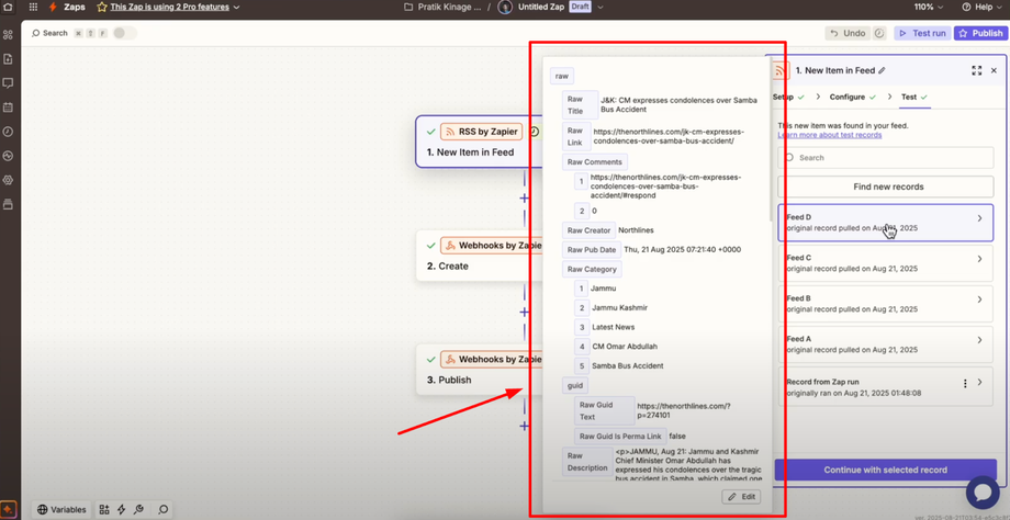 This test confirms that Zapier can access and parse your RSS feed properly before proceeding to the content creation steps.