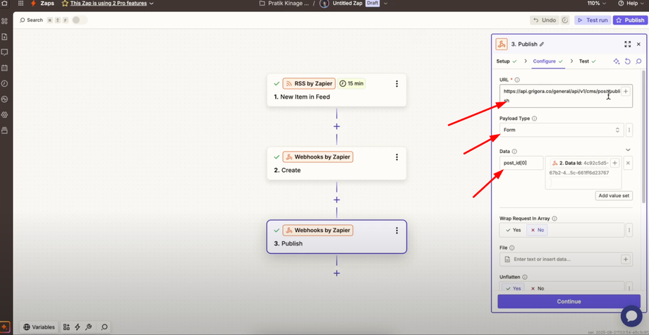 Set payload type to "Form" to match the expected data format. Map the post ID from the create step's output so the correct post gets published - this ensures the automation publishes the right content.