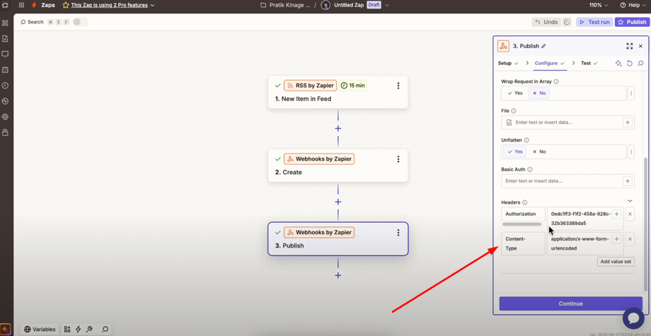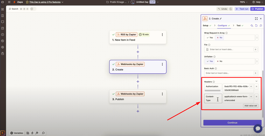 Add authorization with your API key in headers for secure publishing access. Test this action to confirm publishing works properly and that your post transitions from draft to published status.