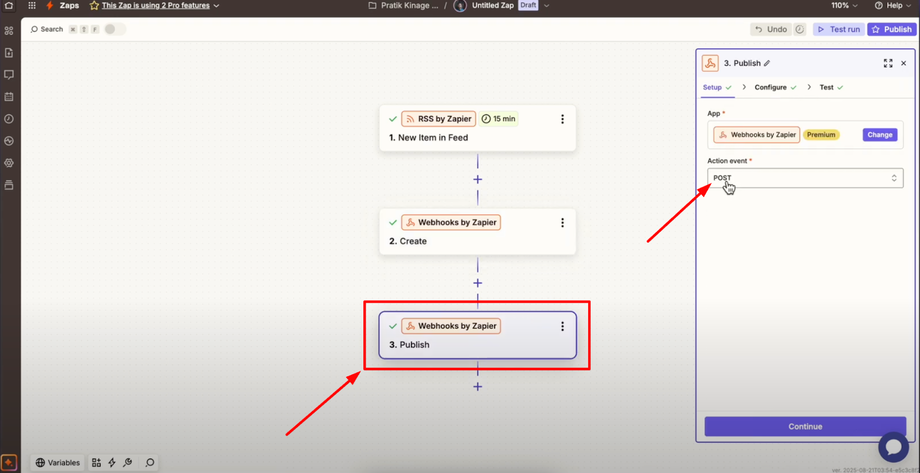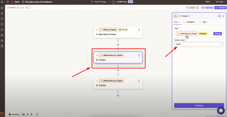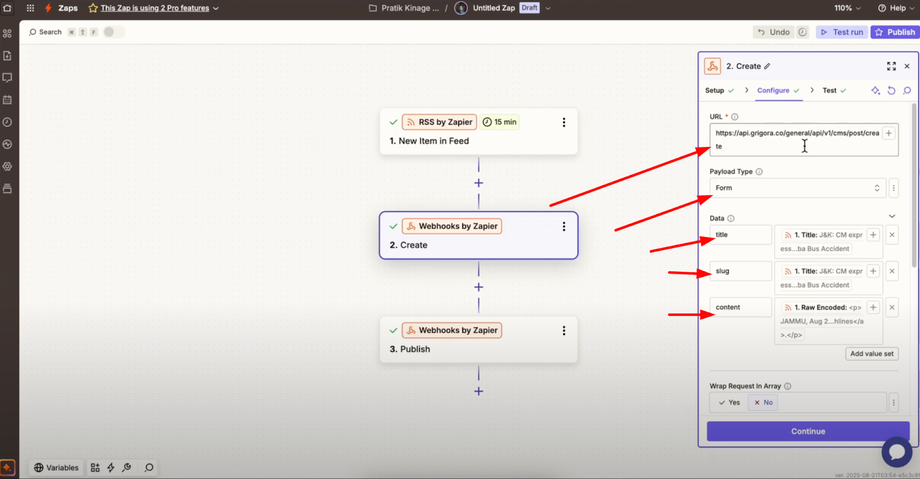 This automation eliminates manual blog posting by connecting RSS feeds directly to your Grigora website. For this workflow, we'll use three steps: RSS by Zapier as the trigger, and two webhooks by Zapier - one to create the post and one to publish it automatically.