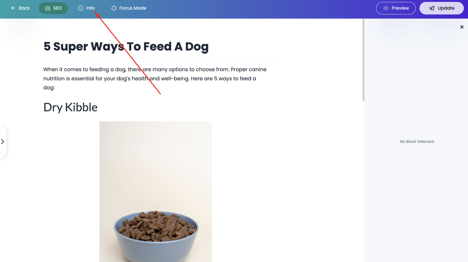 In the top bar of the editing interface, click on the "Info" button. This will open a sidebar with post details.
