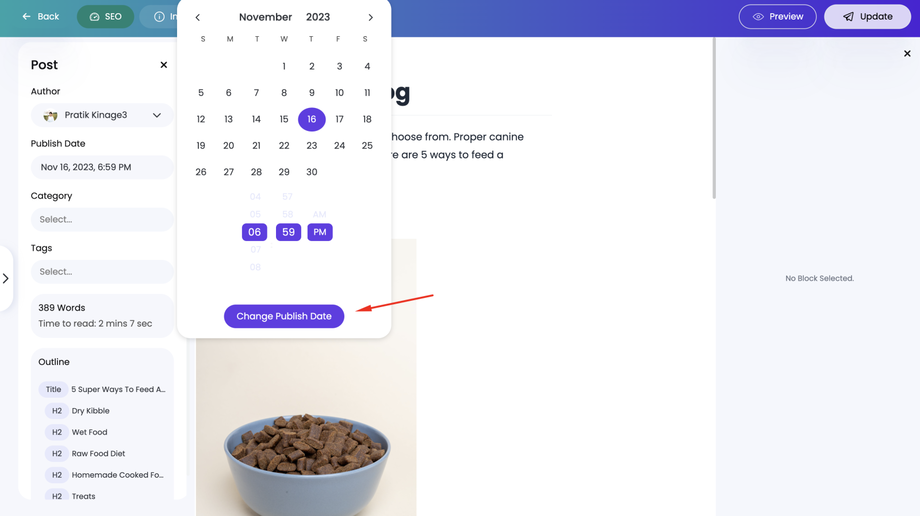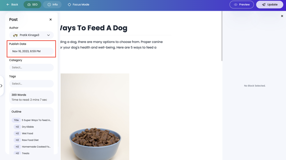Grigora allows you to adjust the published time of your blog posts, providing flexibility in controlling when your content appears to your audience.