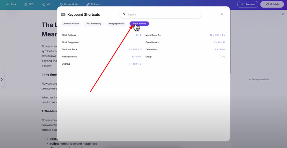 Block Actions: Shortcuts for adding, moving, duplicating, and managing content blocks throughout your post