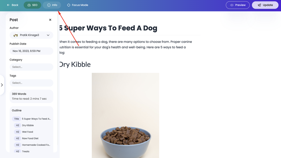 In the top bar of the editing interface, click on the "Info" button. This will open a sidebar with post details.