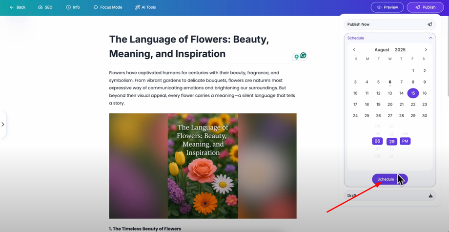 The schedule option allows you to set a specific date and time for your post to go live automatically. Click on "Schedule" and a calendar interface will open where you can select the date you want your post to be published and choose the exact time down to the hour and minute.