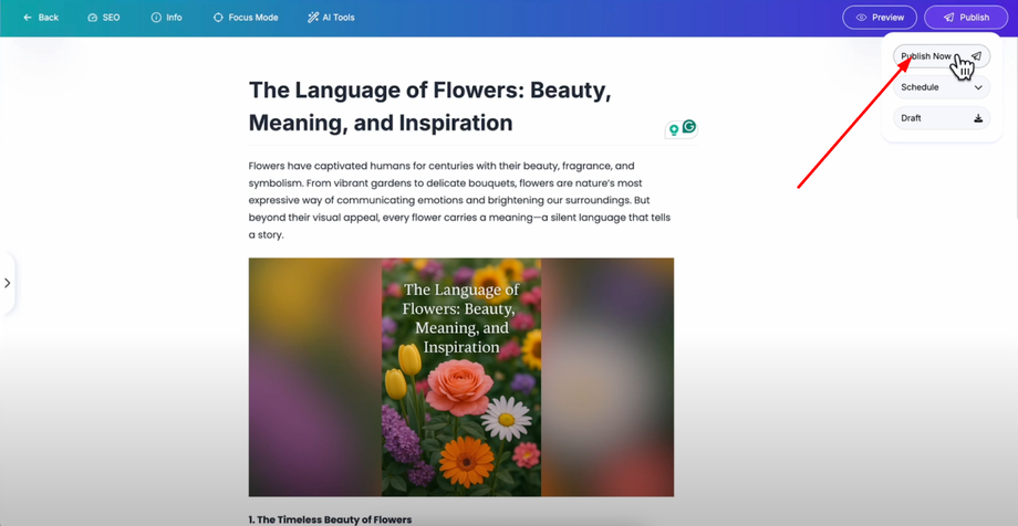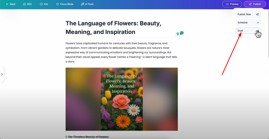 Once you've finished writing your content, look at the top bar on the right side where you'll find the publish button. Click on the publish button and you'll see a dropdown menu with three main options: Publish Now, Schedule, and Draft.
