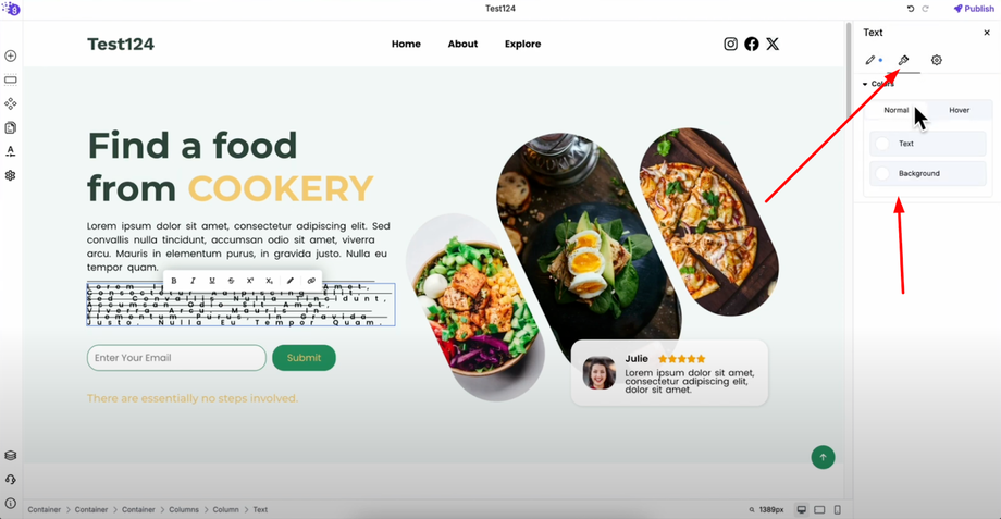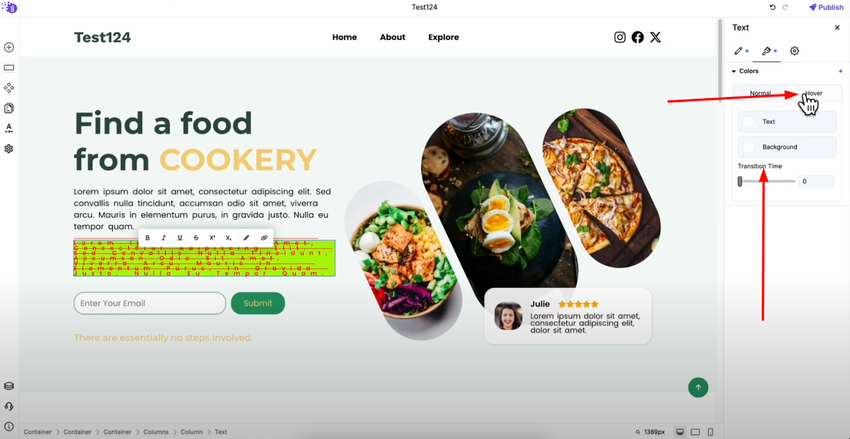 For hover effects, use the hover option next to the color settings to create interactive styling when users hover over your text. This adds professional interactivity that enhances user engagement and provides visual feedback.