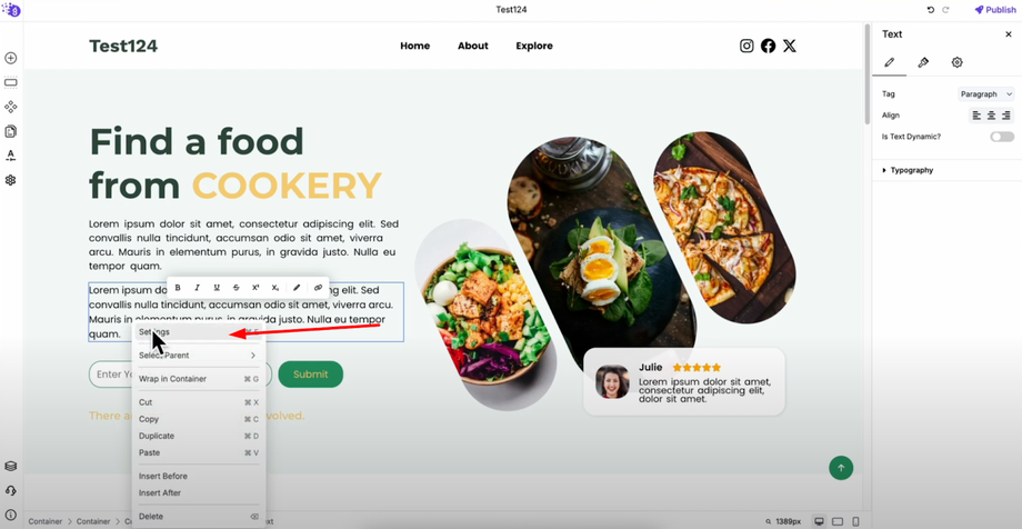 To access styling options, right-click on the text block and select "Settings". This opens the settings panel on the right side where you can control every aspect of your text's appearance and behavior.