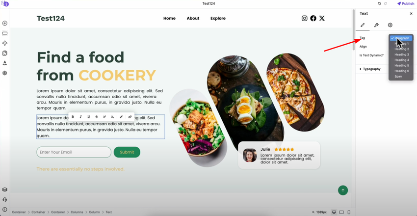 In the first tab, you can change the text tag for proper content hierarchy. Choose from paragraph, H1 to H6 headings, or span elements depending on your content structure and SEO needs.