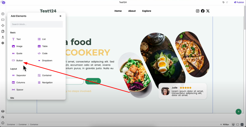 Open the Grigora editor and click on "Add Elements" to access all available design components. Find the button element and drag it into your editor workspace where you want the call-to-action to appear.