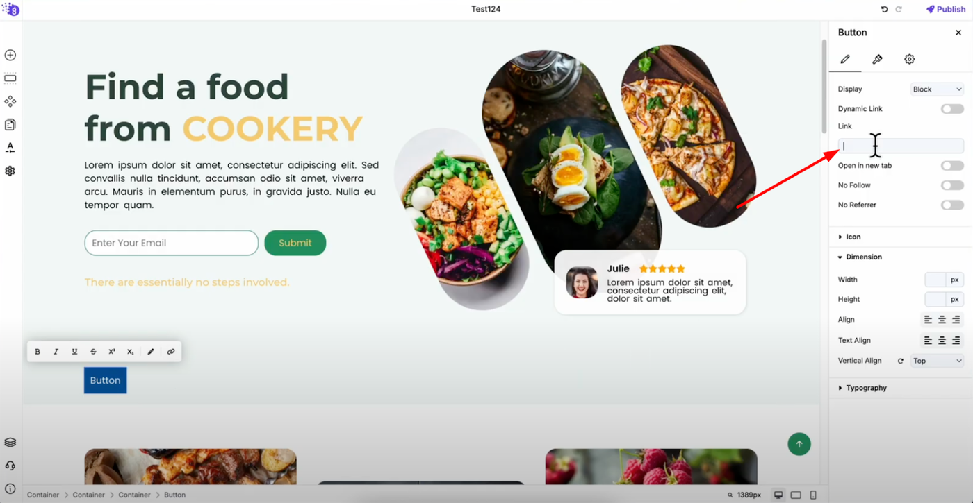 In the settings panel, you'll find a link option where you can paste your URL — this can be an internal page link, external website URL, or file download link depending on your call-to-action goals.