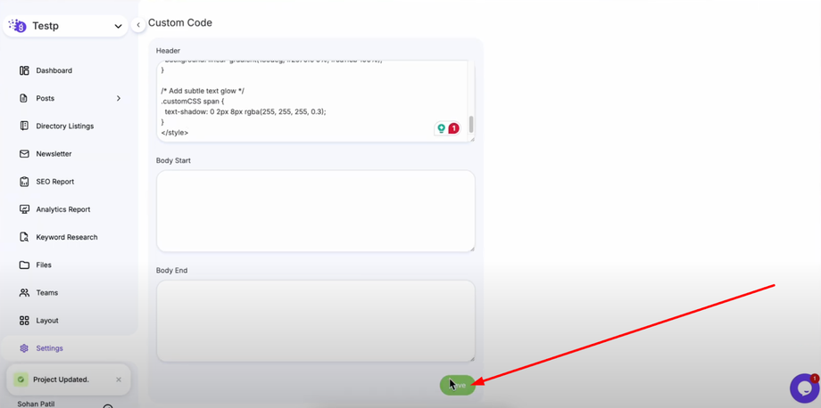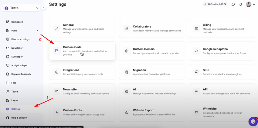 Select "Custom Code" from the settings menu to access the area where you can add custom CSS, JavaScript, and other code snippets to your website.