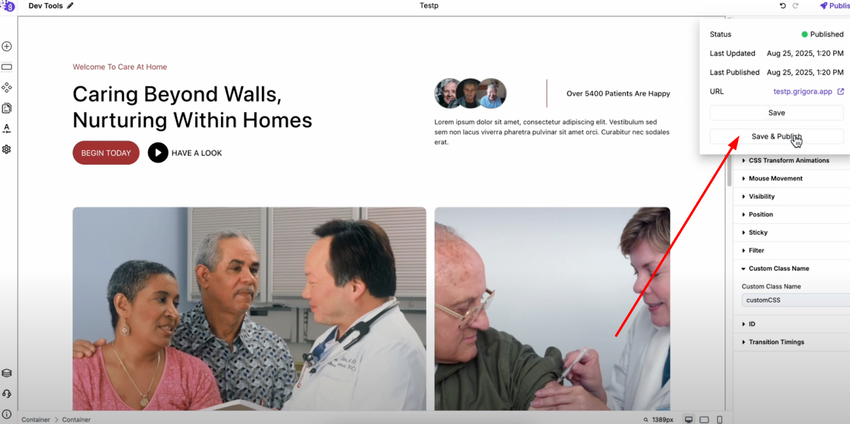 Save and publish the site to ensure your class name changes are applied to the live website. This step is crucial because the custom CSS won't work until the element with the class name is actually present on the published site.