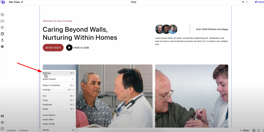 Open Grigora's site editor and navigate to the page containing the element you want to customize. Select the element to which you want to add custom CSS - this can be any element including containers, text blocks, buttons, images, or headers.