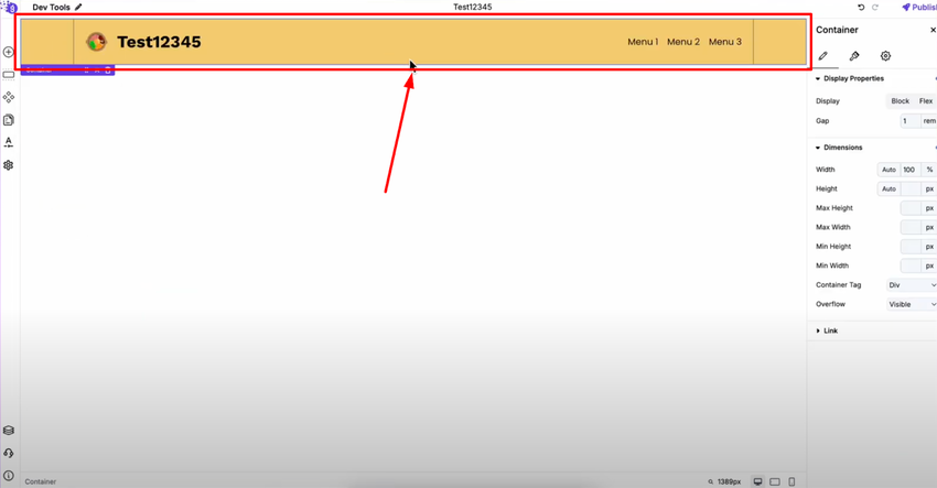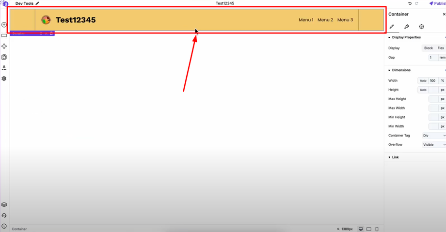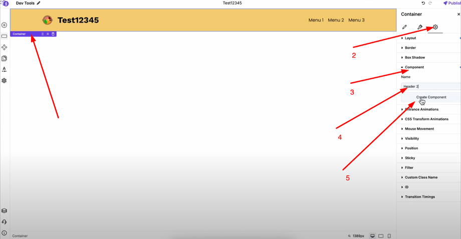 Create as Component: Once your header design is complete, open the settings of its outermost container. Navigate to the advanced settings, then go to the component section. Name your header design and create component.