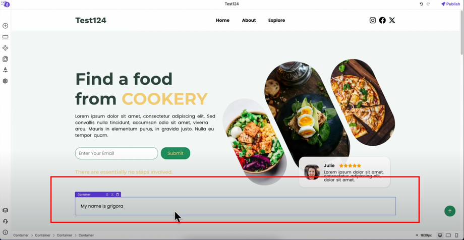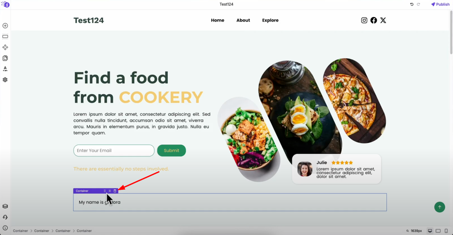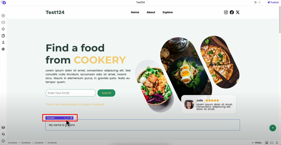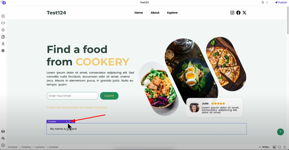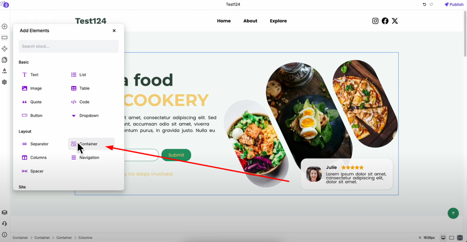 Let's add a container element as an example of the straightforward process. Simply drag the container from the elements list and drop it into your editor workspace where you want it positioned.