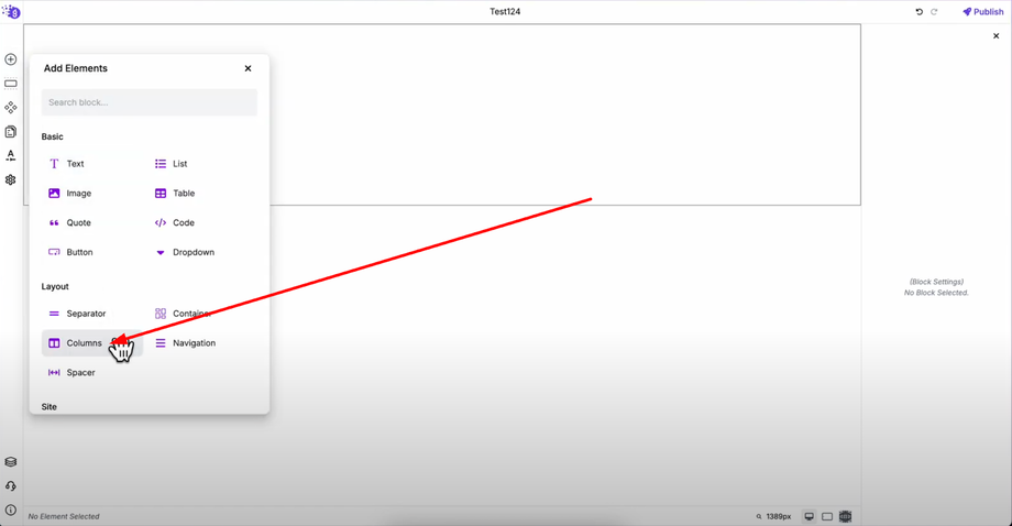 Open the Grigora editor and click "Add Elements" from the left panel. Drag the columns block into your editor to begin creating your layout structure.