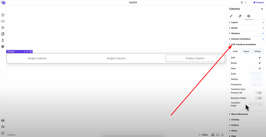 CSS Transform Animations: Advanced controls for shift, rotate, skew, scale, opacity, perspective, and more. Configure for initial, hover, and infinite animation states for dynamic interactive experiences.