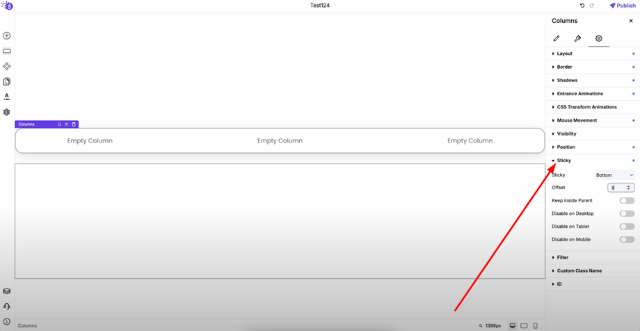 Sticky Behavior: Make columns stick to top or bottom with offset controls and parent container limits. Disable sticky behavior per device as needed for optimal user experience across different screen sizes.