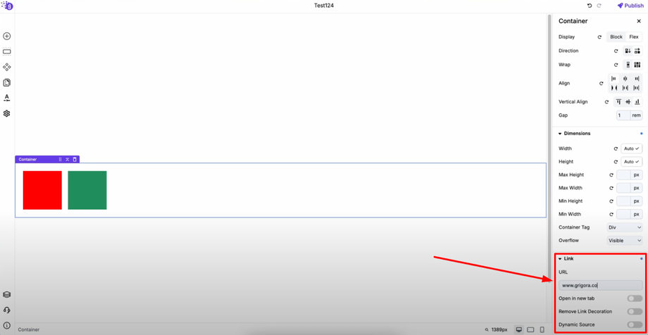 Link Functionality: Make your container clickable with URL input for links, open in new tab toggle, and remove link decoration toggle