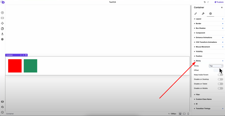 Sticky Behavior: Make containers stick to top or bottom with offset controls and parent container limits, plus device-specific disable options available
