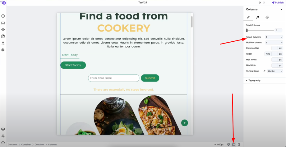 Here's the key to responsive design: On tablet view, instead of showing two columns side by side, set it to display one column at a time. This prevents the layout from looking cluttered on smaller screens and ensures content remains easily scannable.