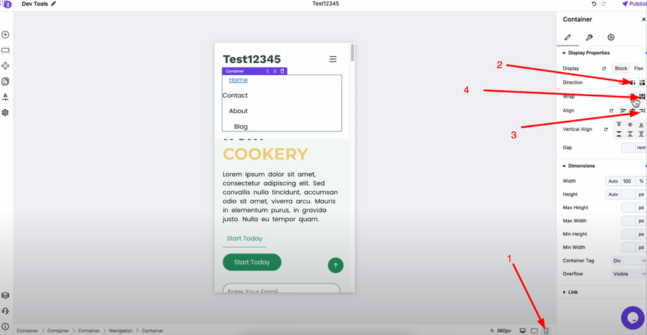 Switch to mobile view and select the container inside your navigation block. Change the flex direction to "column" so menu items stack vertically. Align items to the right and set wrap to "no wrap" for clean mobile navigation that works well with the hamburger menu functionality.