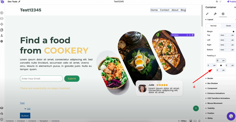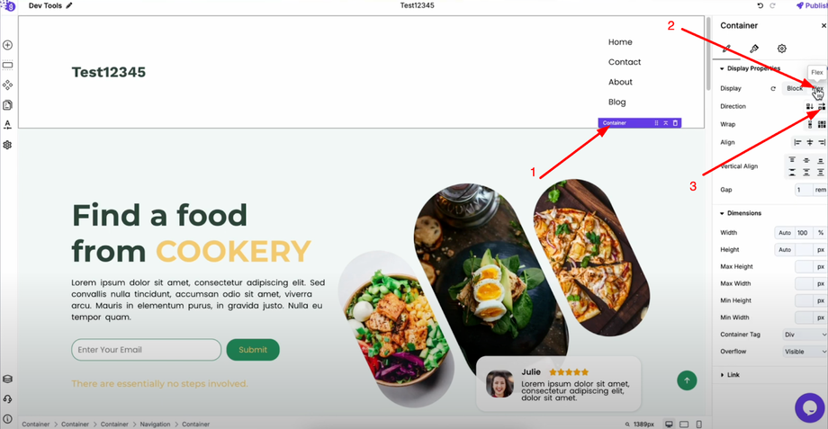 By default, menu items stack vertically. To create a proper horizontal menu, select the container and change its display to flex in the settings. Set the direction to "row" to convert your menu items into a horizontal layout. If there's unwanted padding around the container, remove it by going to advanced settings and setting padding to zero.