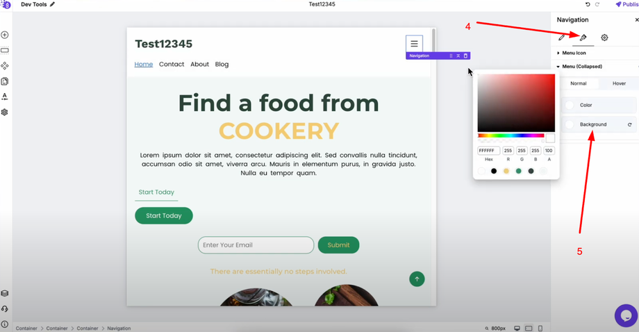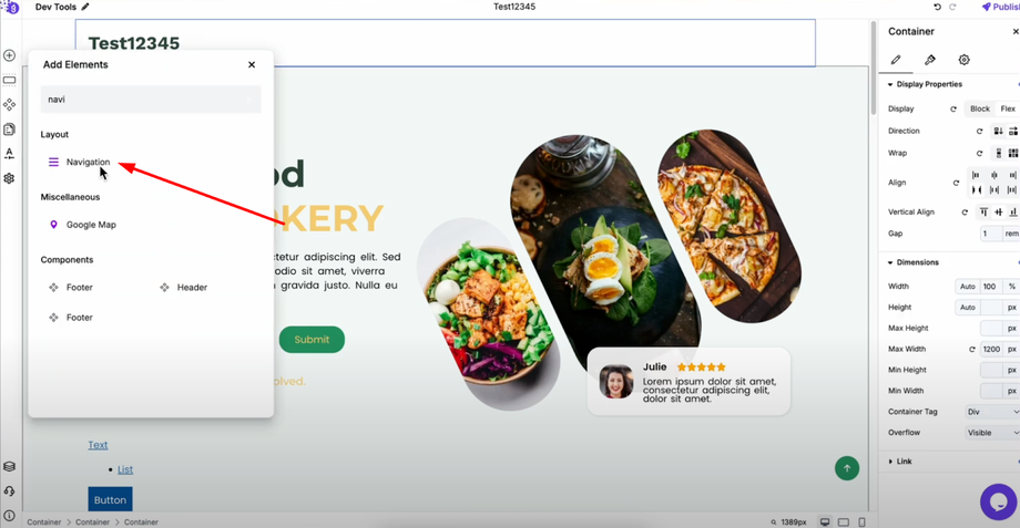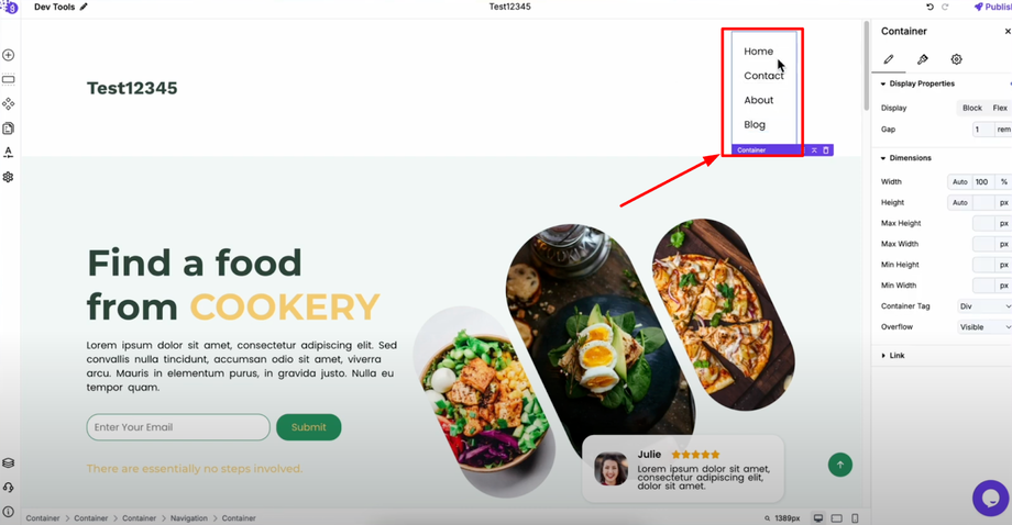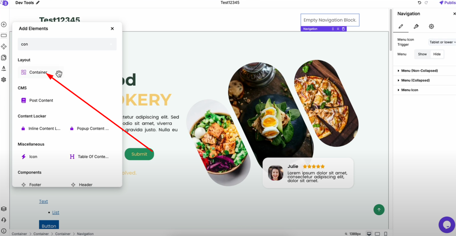 Once added, insert a container inside the navigation block to properly structure your layout. This container will hold all your menu items and allow you to control their positioning.