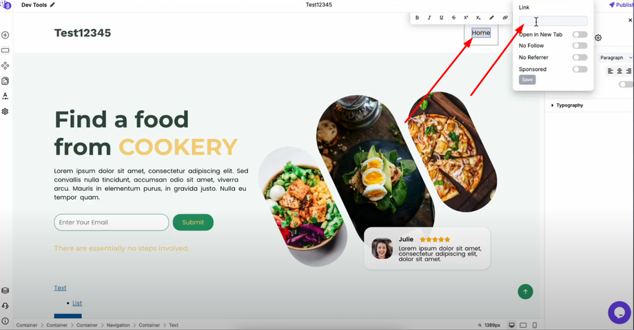 Add text blocks for each menu item you want (Home, Contact, About, Blog, etc.). Double-click on each text block to add links that direct users to the appropriate pages.(Reference to links article).