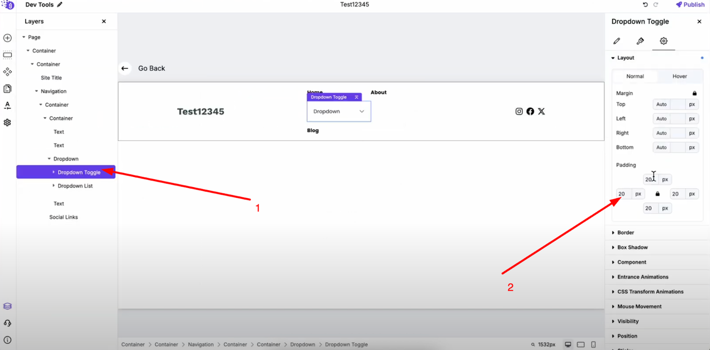 Open the dropdown block's settings to begin customization. Set the padding of the dropdown toggle to zero for clean integration with your header design and optimal spacing control.