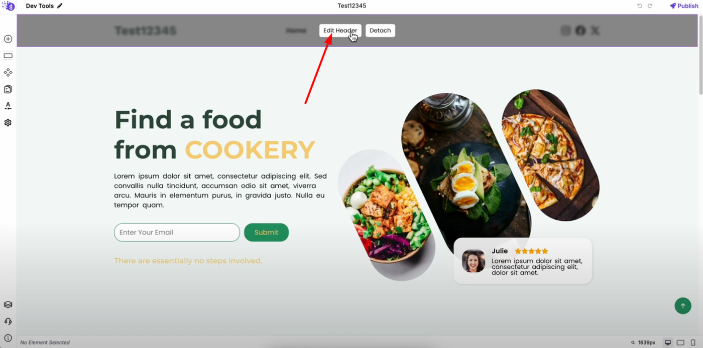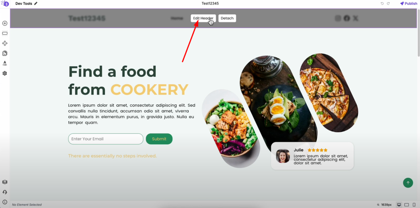 Open Grigora's site editor and navigate to your header area. Click "Edit Header" to open the header section where you'll add your dropdown navigation.