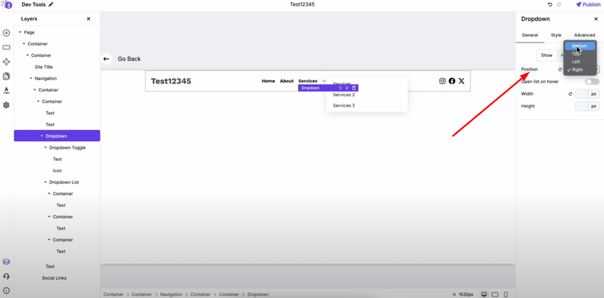 Position setting allows you to choose top, left, right, or bottom for the dropdown list placement. This flexibility ensures your dropdown appears in the optimal location relative to your toggle button and doesn't interfere with other page elements.