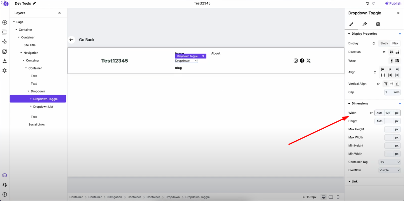 Adjust the dropdown toggle's width as needed to maintain visual balance with other navigation elements. Now the dropdown toggle is added to the layout and ready for content customization.